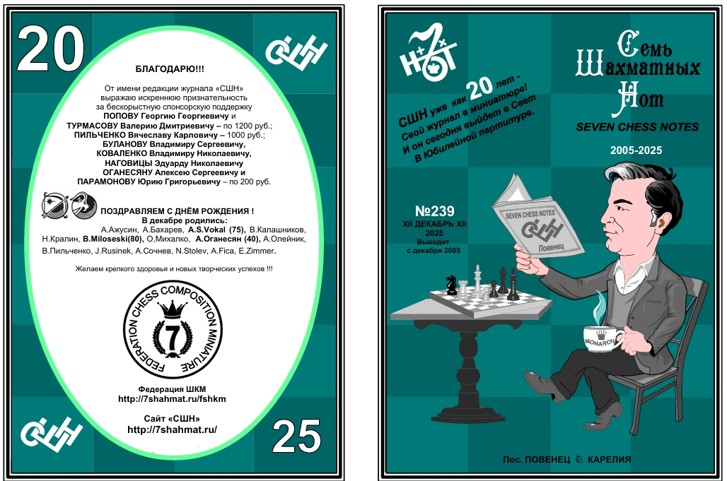 Вышел очередной номер журнала "Семь шахматных нот" №239, декабрь 2025. В номере: В.Иванов "Журналу "СШН" - 20 лет!; Посвящения, поздравления и пожелания от шахматных композиторов по случаю юбилея журнала; Федерация шахматной композиции миниатюры: 1.Рейтинг миниатюристов 2025. 2.Приказ №24 от 01.10 2025 о присвоении судейских категорий; Всемирный чемпионат миниатюристов (этюды, обратные маты); Наши партнёры 2025; Объявление о проведении годового конкурса "СШН-2026"; Опубликовано 45 оригинальных композиций; Спонсоры, поздравления с Днём Рождения.