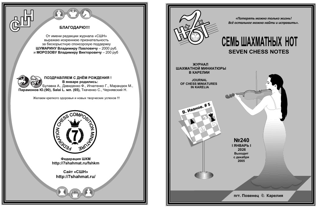 Вышел очередной номер журнала "СШН" №240, январь 2026 г. В номере: В.Пильченко. Предварительные итоги годового (юбилейного "СШН-20", # 2) конкурса; В.Чепижный "Классика", выпуск №110; ФШКМ. Альбом 2016-2018, трёхходовки (продолжение); Рубрика. "Даты на память"; Каталок журнала "СШН-2025"; В.Иванов. Шахматный ребус; Опубликовано 45 оригинальных композиций; Спонсоры, поздравления.